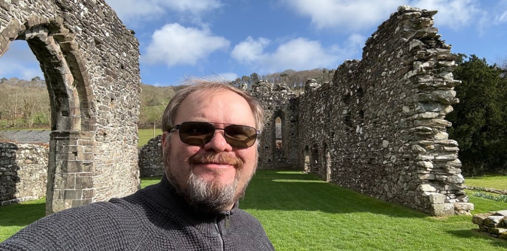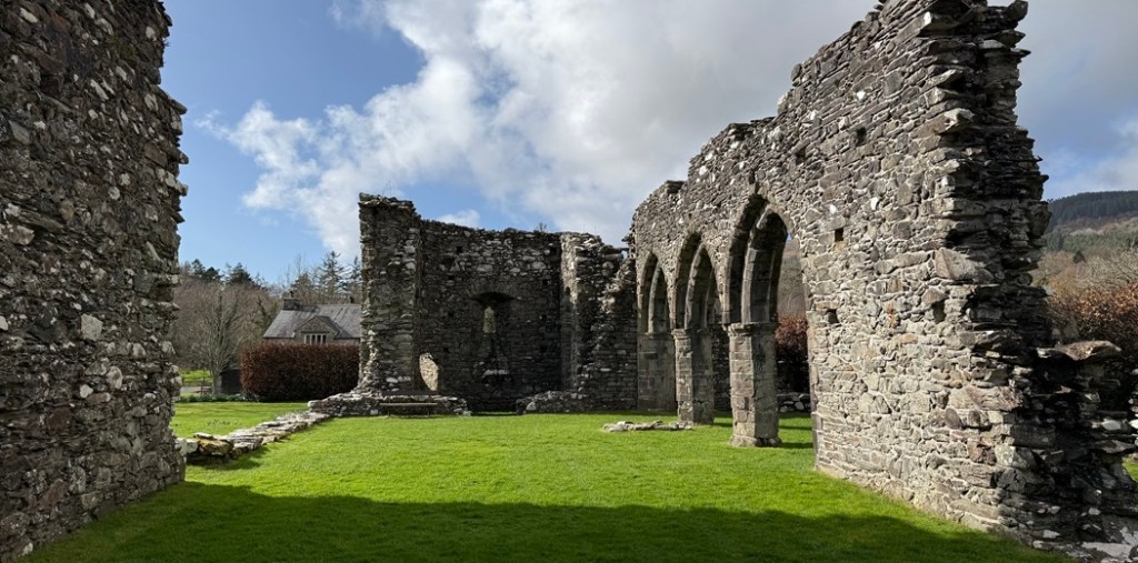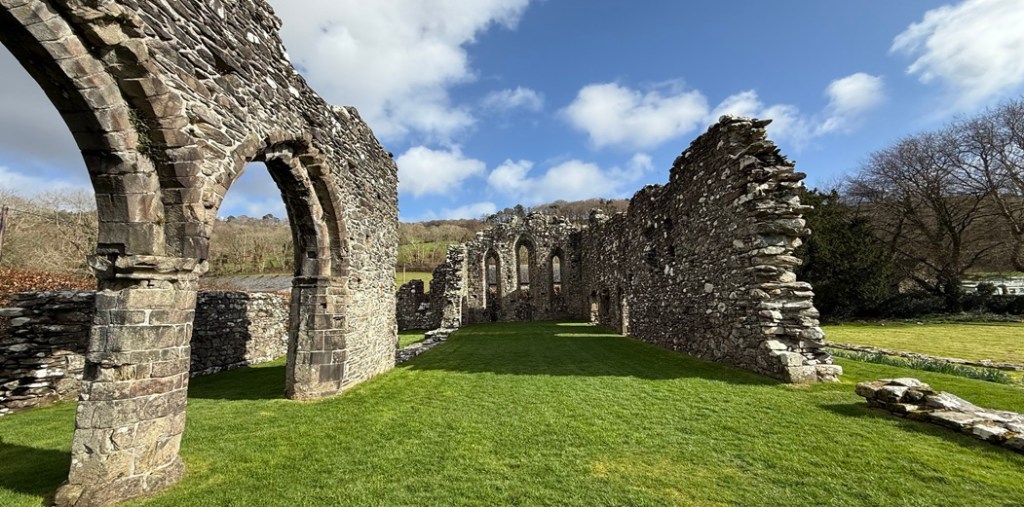 Anna and I both love these kinds of adventures, the chance to slow down, step away from the rush of popular attractions, and wander toward places that feel tucked out of sight. We’ve discovered a local gaol and a railway carriage museum on our travels packed full of character. As ever, a helpful brown sign guided us toward the abbey. Wales is full of castle and abbey ruins, each with its own stories and potential for exploration, but there was no grand decision behind choosing this one. It was simple curiosity, the purest form of Brown Sign adventuring. We pulled into the small car park, laced up our boots, and set off on foot, ready to see what this hidden treasure might reveal. It felt a little desolate, with not a soul in sight but the best adventures come from exploring these ruins on our own.