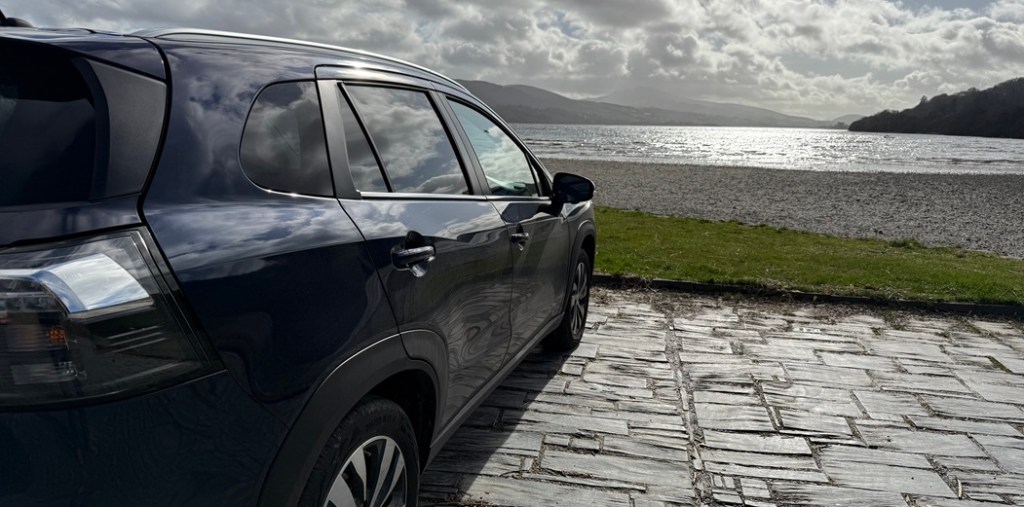 Heading toward the town centre, another stopping point presented itself – this one a little more sheltered from the wind. We pulled in to take another photo together and to enjoy the view across the lake. In summer, I imagine it would be a busy spot, full of families and walkers, but on this cold March afternoon the car park was almost entirely empty. Aside from a hopelessly optimistic ice‑cream van braving single‑digit temperatures, we had the place to ourselves. It felt perfectly in keeping with the spirit of our Brown Sign Adventure: quiet, unhurried, and wonderfully peaceful. A pang of hunger eventually nudged us back into the town, where we found the only butcher still open, offering deli meats and a few simple treats. We gathered a small picnic and took it back to the cottage to enjoy after a day of gentle exploration.