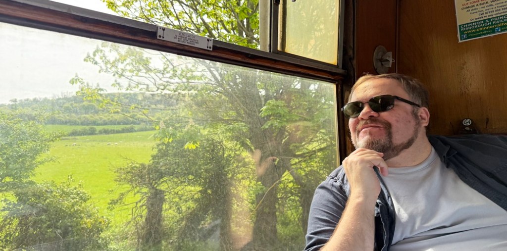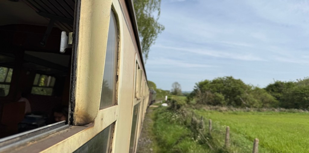 Every heritage line we visit ends up with its own informal scoring system – entirely unscientific measures of excellence that help us grade the day. One such measure is the presence of a tea room, and this one not only passed but exceeded Anna’s expectations by offering a full pint of orange squash. While I wandered along the platform waiting for the train to arrive, she returned triumphantly with a pasty and her squash, and we spent a few minutes sitting in the marquee tent on the platform, surrounded by volunteers, travellers, and families enjoying a grand day out. The diesel and steam services share the same carriages, with the engines swapped just outside the station, and with ten minutes to spare the diesel trundled into view. We boarded, joining a carriage full of excited train enthusiasts and cheerful staff eager to share their stories, before departing exactly on time.