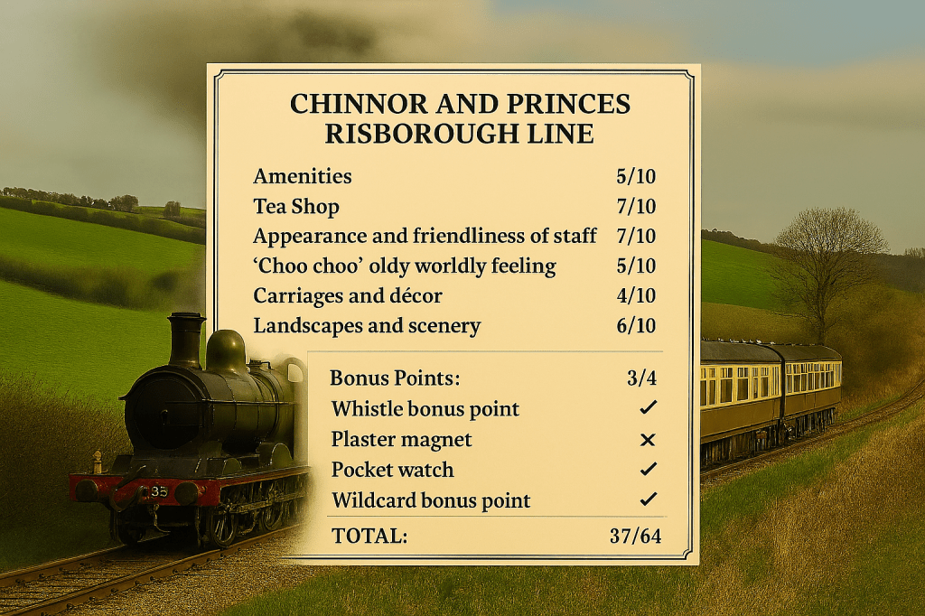 The diesel departed exactly on time, with only seconds to spare, and brought us back into Chinnor a short while later. With a Day Rover ticket you can happily shuttle back and forth at your own pace, so we stayed onboard, switched over to the steam locomotive, and enjoyed the traditional sights and sounds of a heritage line as it carried us back up the track. After our return journey we lingered for a few moments, browsing the gift shop, picking up another souvenir magnet with the station name, and stopping to take a few photos of the front of the train. The whole experience is run by volunteers and enthusiasts who know their audience well and never seem to mind accommodating a few extra pictures, even if it delays departure by a minute or two. The onboard team were equally delightful, offering to take photos for guests at their tables – a small personal touch that summed up the warmth and charm of our entire day on this particular railway.